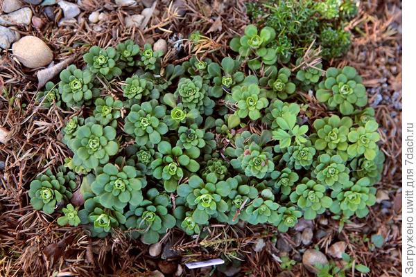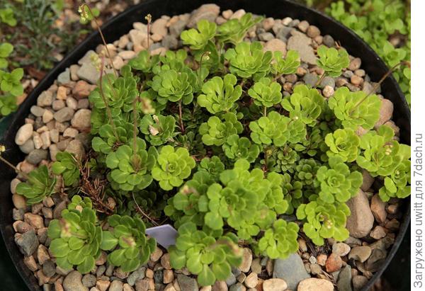 У меня этот вид разрастается очень хорошо, образуя плотную дернину. Листья кожистые, блестящие, клиновидные, собраны в маленькую прикорневую розетку, диаметр самой крупной из них 3,5-4 см. В Тверской области зимуют на камнях под снегом без проблем, хотя заявлена морозостойкость до -23°С, еще и очень активно нарастает.