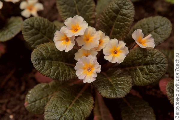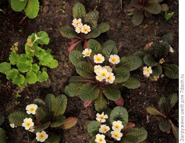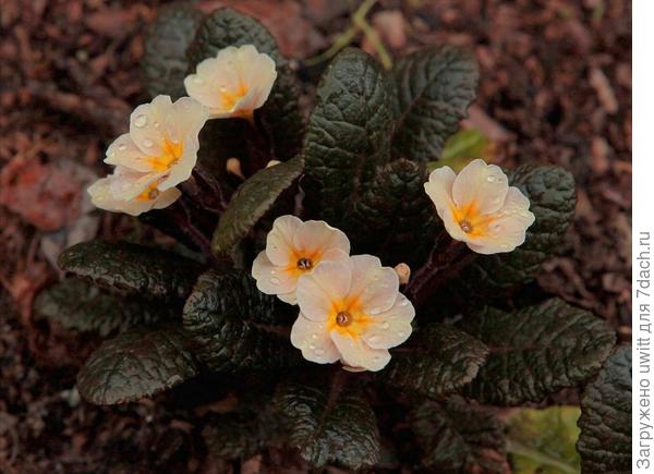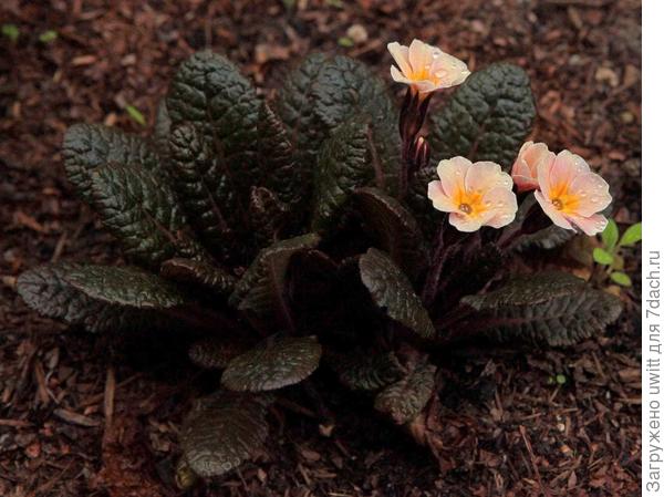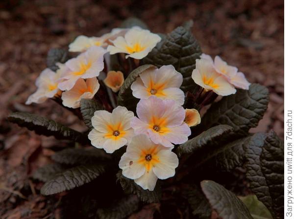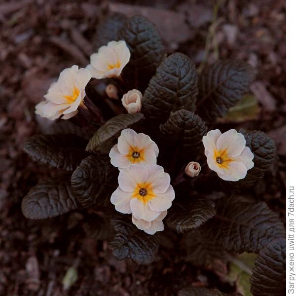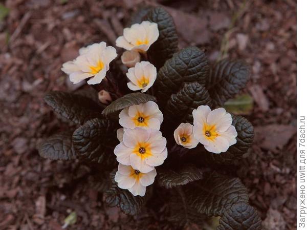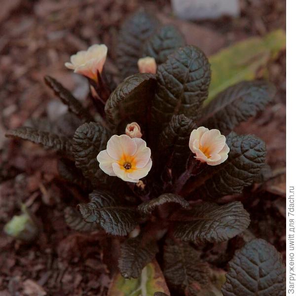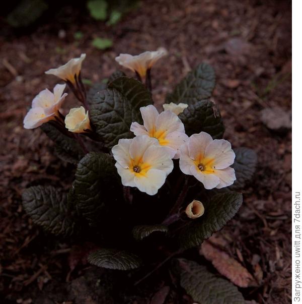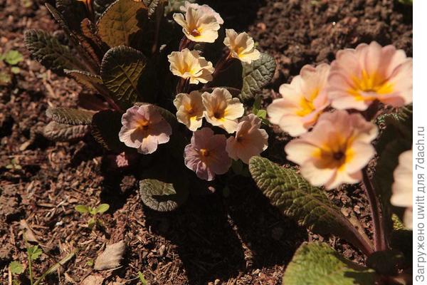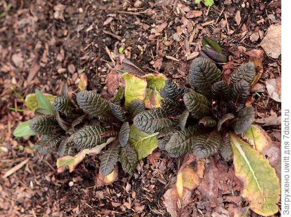 Высадив примулу на клумбу-грядку с краю, направленному на восток (рассвет солнца), к обеду растение оказывается полностью в тени построек и проявляет всю свою темнолистность в полной мере, к концу цветения листья уже более зеленеют.