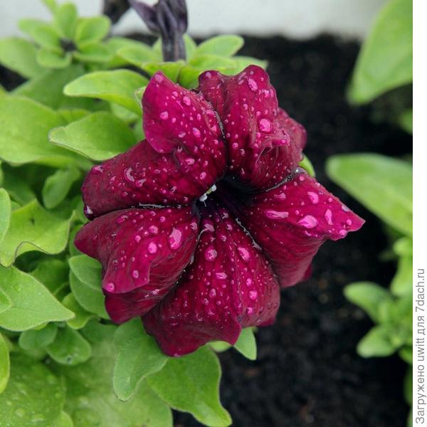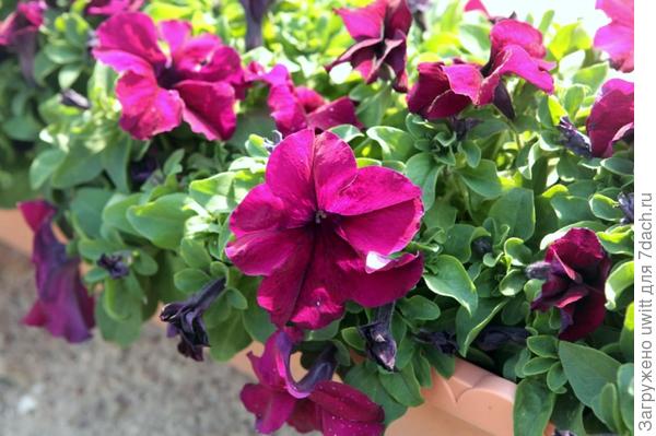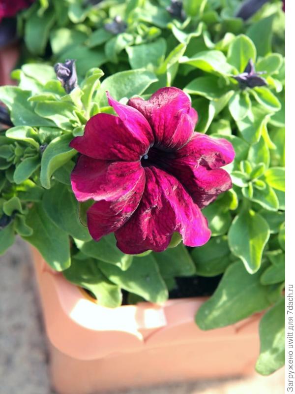Ведь высота кустиков петунии 'Бургунди' около 15 см, при этом сорт крупноцветковый. Зная это, мы дочкой уже ползаем давно с линейкой вокруг него, и цифры повторяем, и изучаем, как делать замеры, и ищем рекордный цветок. Самый большой у нас пока — 9 см в диаметре.