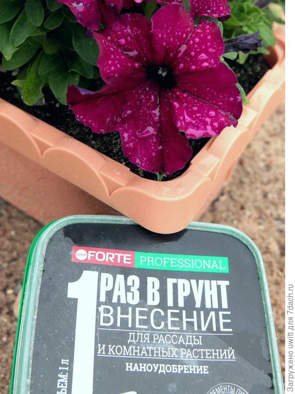 Как-то Влада — цветочная фея Семидачья — рекомендовала давать 3,5-4 л на одно растение при высадке в кашпо. Посадили с ребёнком рассаду в балконный ящик на 25 л, стараясь не загущать посадку, у нас поместилось 6 саженцев. Грунт использовали «Волшебная грядка» от «Буйских удобрений», смешав его песком и с «Наноудобрением для рассады и комнатных растений» от «Bona Forte», которое идеально подходит любым растениям, выращиваемым в кашпо, горшках, балконных ящиках и прочих емкостях.