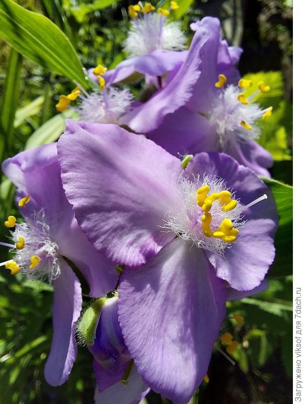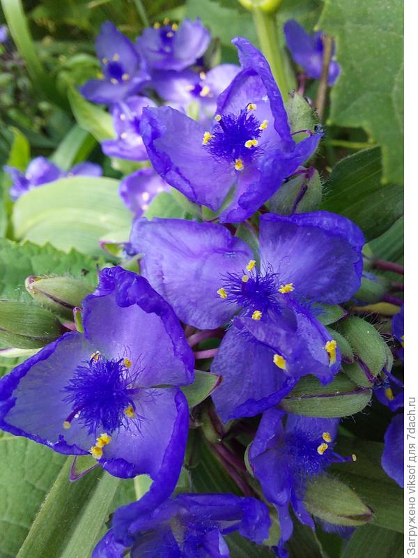 Традесканция 'Concord Grape' с темно-зелеными листьями с серебристым налётом, они кажутся практически голубыми. Самая высокая, до 50 см. Цветки пурпурно-фиолетовые. У меня потребовала опоры стеблей, и я их просто связала атласной лентой, и они хорошо сами себя держали. Морозостойкость до -35°С.