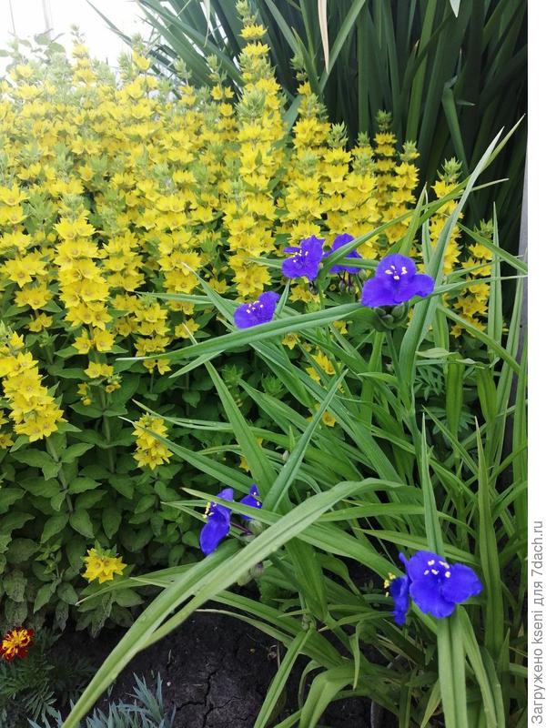 Традесканция 'Sweet Kate' самая низкая (около 30-35 см), цвела почти синими цветками, которые на фоне желтых листьев просто потрясали красотой. Морозостойкость -40°С.