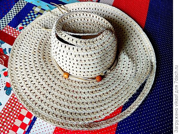 У меня эту шляпку немного потрепала соседская собачонка! Я взяла вязаную салфеточку и пришила ее вместо донышка, а к полям пришила подкладку из тоненькой х/б рубашки мужа в нежно-голубую клеточку и тесьмой украсила!
