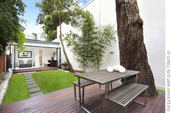 В австралийском минимализме мощение патио традиционно делается из дерева. Но не так, как это обычно получается в европейских коттеджах, а со своим, слегка футуристическим шармом. Вокруг патио часто выполнена строго геометричная посадка растений и организована такая же подсветка. Вместе они по вечерам разыгрывают настоящее шоу в духе минимализма. Кстати, на роль подсветки прекрасно подойдет и гирлянда, но одноцветная — желтая или, лучше, сиреневая.