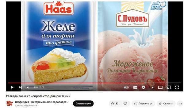 А при анализе загустителей автор вывел нас на… пакетики с желе и с мороженым! Так как один из загустителей близок по составу к составу пакетика для приготовления желе, а другой — на состав пакетика с мороженым. Предположение — в составах пакетиков пищевые добавки Е412 и Е466, способствующие тому, чтобы при низких температурах вода (сок растения) превращался не в ледышку… а в недоледышку, как в желе и мороженом.