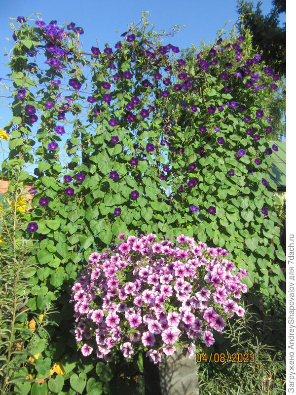 У Андрея 15 кустов «не той» ипомеи)) Вероятнее всего у Андрея Purple Morning Glory — ипомея Ipomoea purpurea.