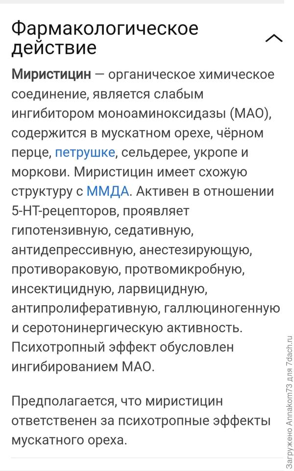 Миристицин содержится в мускатных орехах, по ним есть исследования, это заключение оттуда. Как и это: «Миристицин на самом деле придает мускатному ореху галлюциногенные свойства, но только в дозах, превышающих те, которые обычно используются в кулинарии и в рецептах для приготовления глинтвейна.»