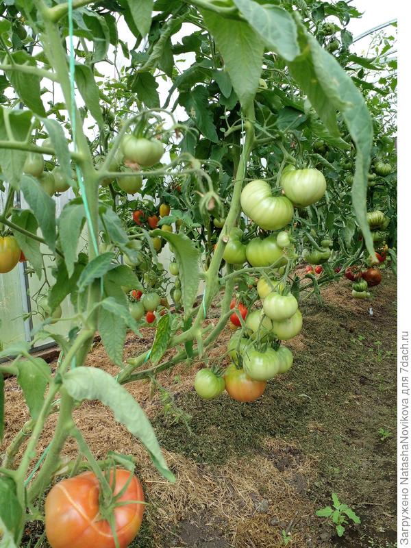 Куст очень мощный. Значительным плюсом этого томата хочу отметить, что он обладает просто обалденными вкусовыми качествами и потрясающе неприхотлив в уходе (в этом году рос опутанный тыквой, которую я случайно посадила в теплицу, перепутав с огурцом)) и вяжет томаты до самой макушки, причем томаты одинакового веса от первой до последней кисти.