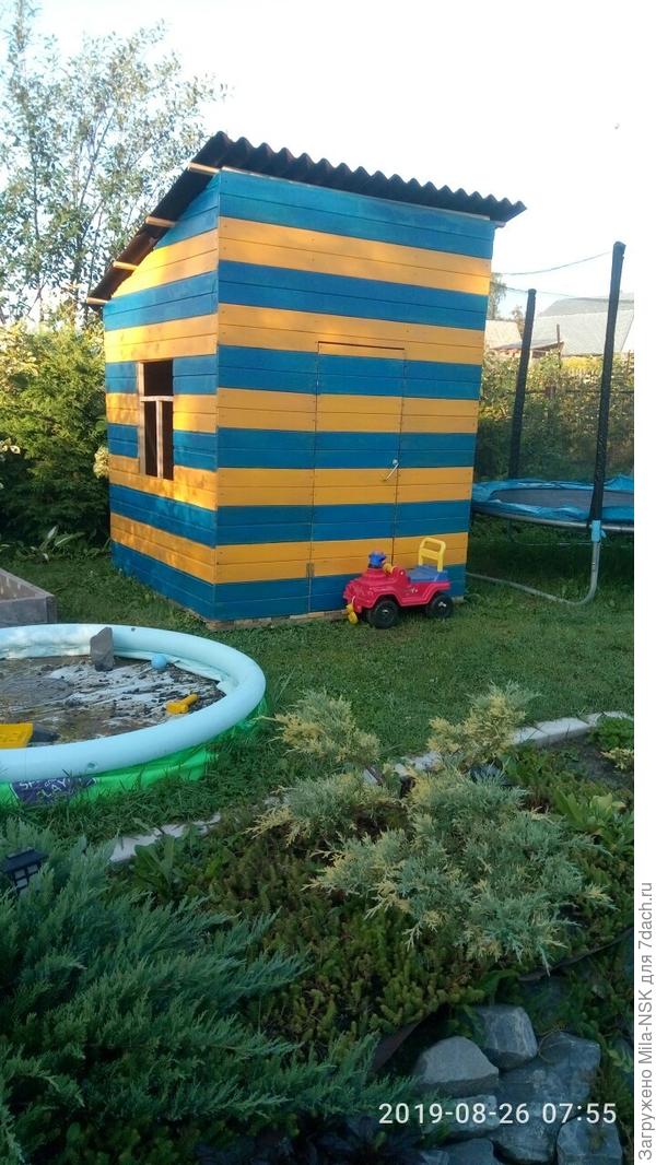 Вот здесь на фото видна наша детская площадка. Ширина этой терраски 6 м. Места для всего остального уже нет. К цветникам, которые по приметру у меня проход очень узкий. Но нам пришлось так сделать. благо, на след.год практически все дети заберут на свою дачу, которую они на прошлой неделе купили.