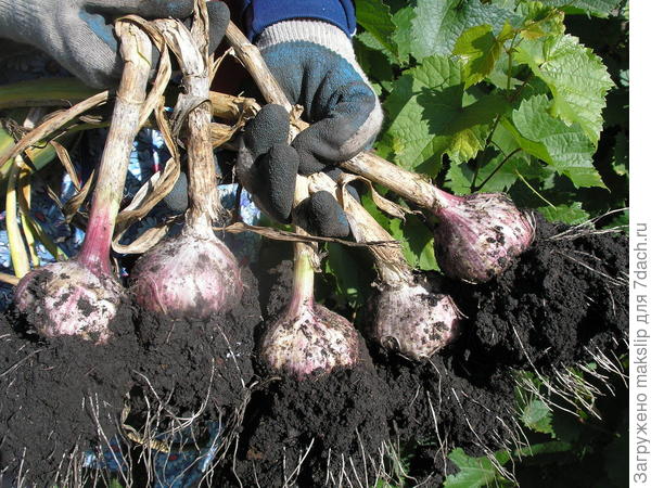 У нас не особо хороший чеснок выдался, да и озимый лук тоже. Грядка была в глубине огорода, ходить туда часто не требовалось, да и сил уже не хватало, поливал пару раз. Пока тут разговаривали, мы убрали весь чеснок и озимый лук.